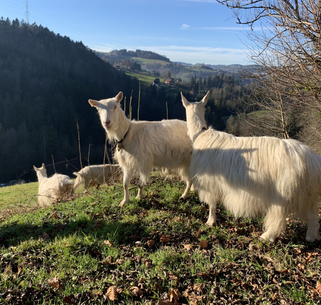 Unsere Ziegen sind bei schönen Wetter auf den Wiesen unterwegs und knabbern an den Dornen der Randbereiche. Wenn der Zaun geflickt oder angepasst werden muss, sind sie für das Überwachen der Arbeiten gerne zur Stelle. So waren sie auch vor der Weihnachtszeit, bei strahlendem Sonnenschein an den obersten Stellen der Achwis mit mir unterwegs. Pünktlich am „Väsper“ stehen sie dann vor dem Stall und wollen „ine“ – geniessen noch etwas Heu und träumen dann hoffentlich von den nächsten Dornen…